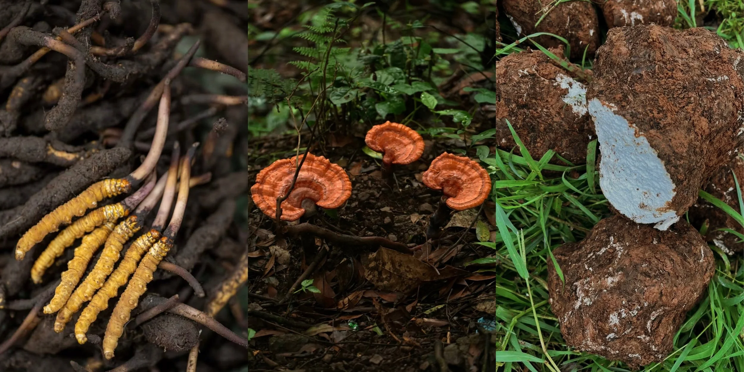 Fungi used in traditional Chinese medicine, from left to right: Cordyceps, Reishi and Poria cocos